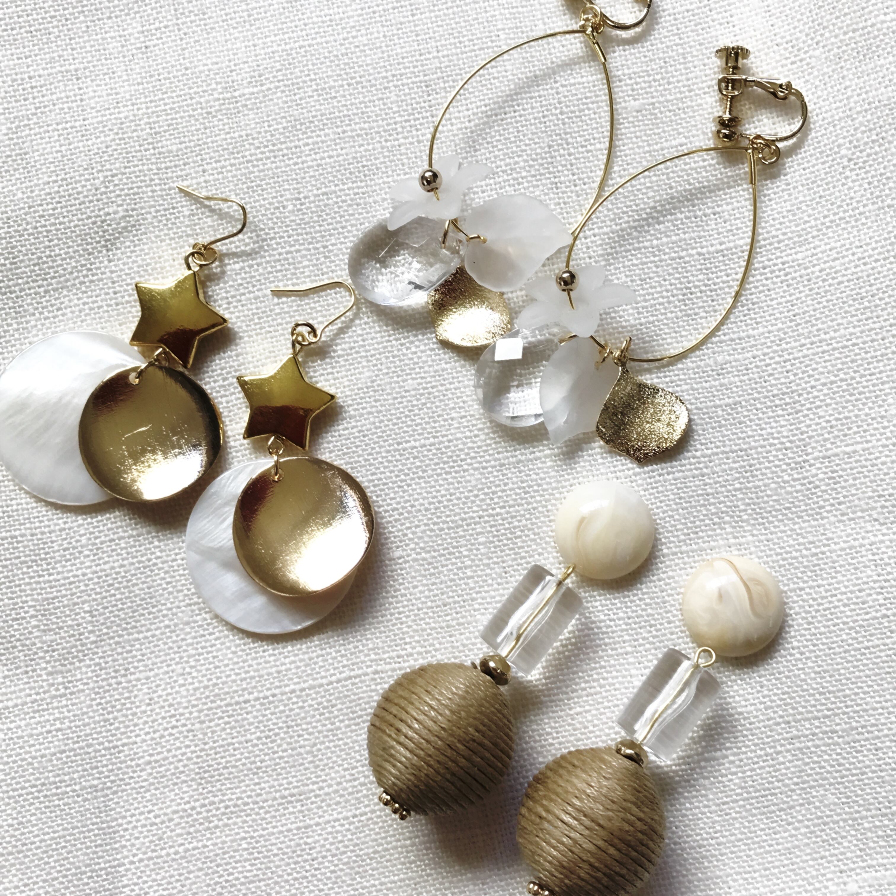 マーブルカボションと糸巻き ピアス イヤリング ラタン