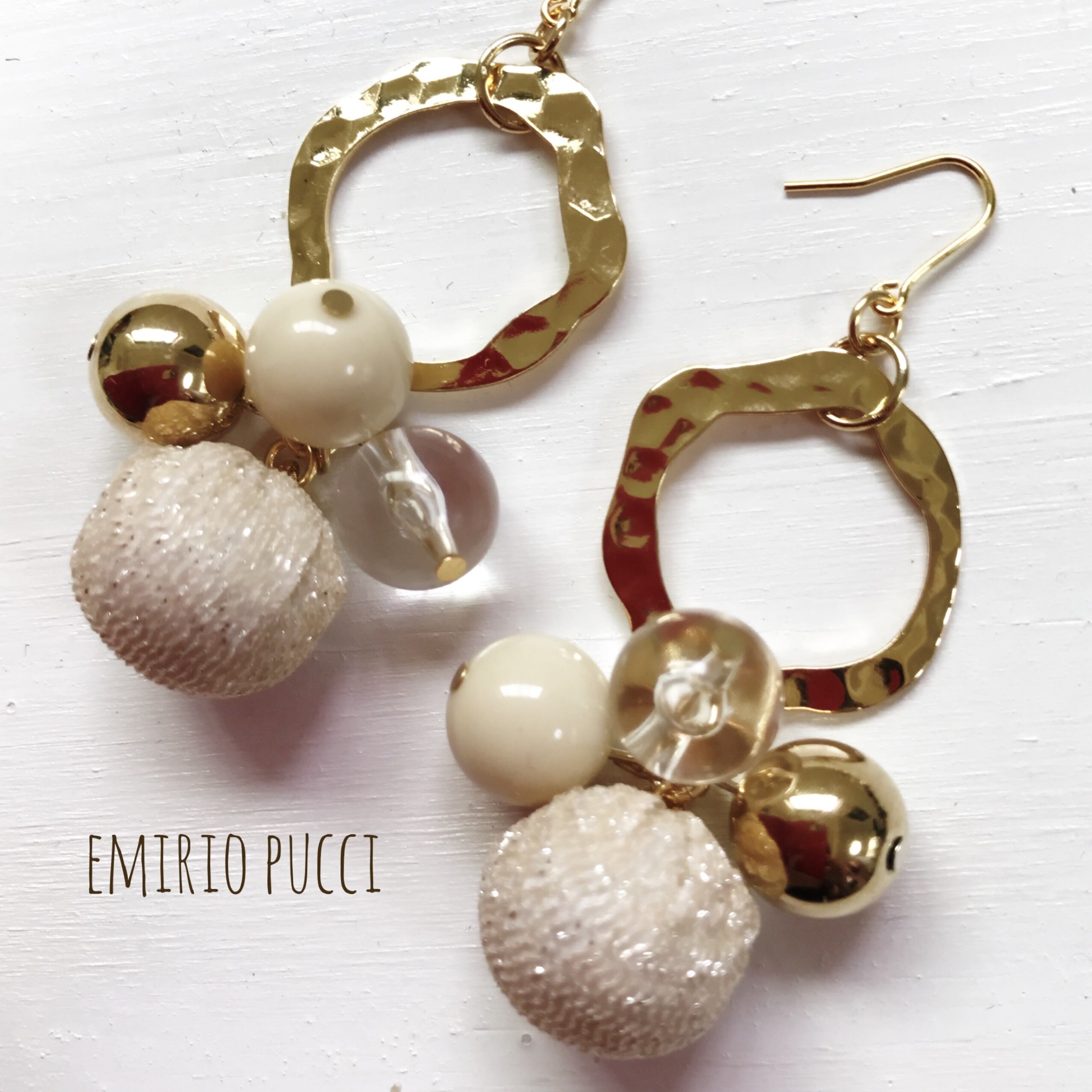 ゴールドリングにベージュのチャームを合わせ