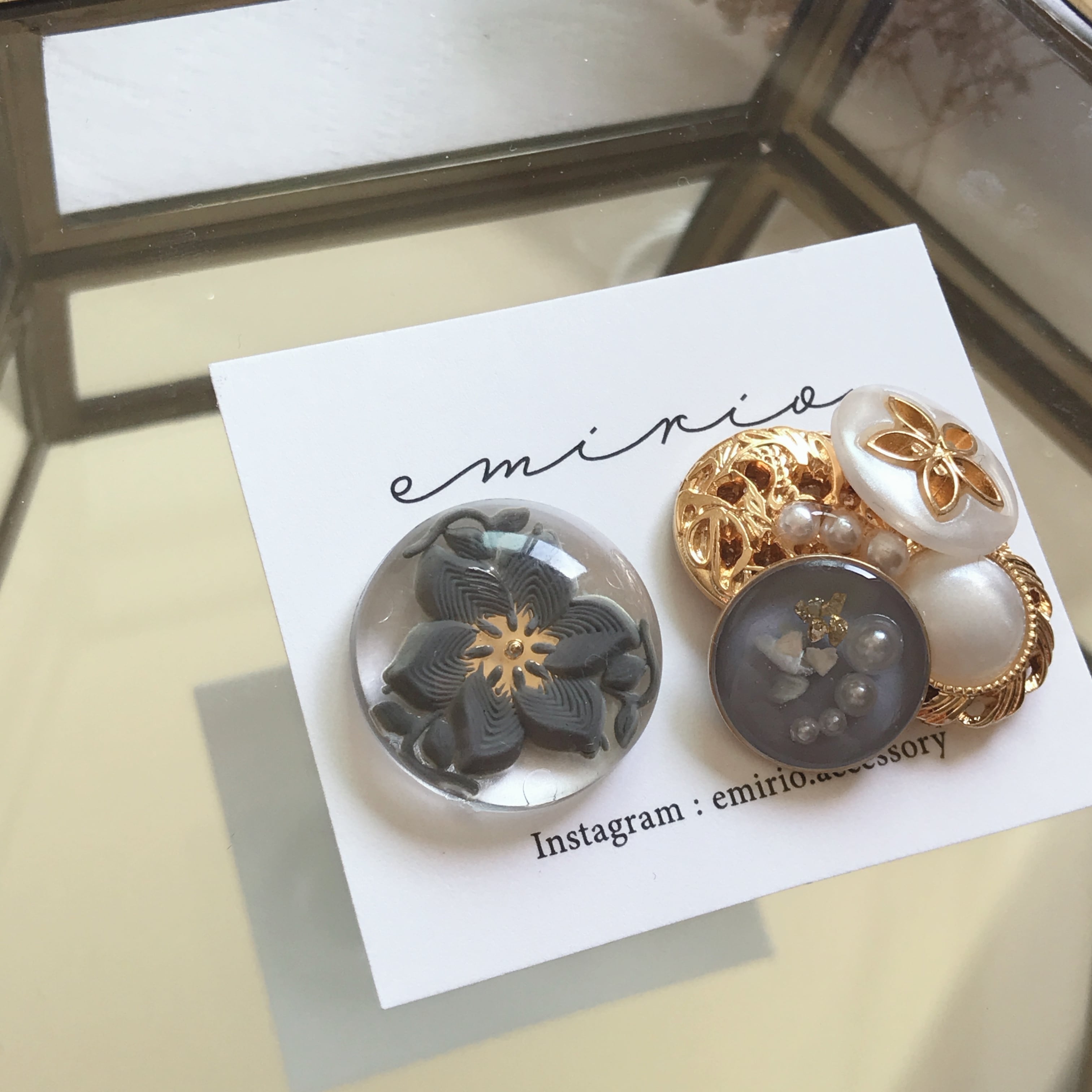 お花のボタンに落ち着いた色味のレジンを合わせ